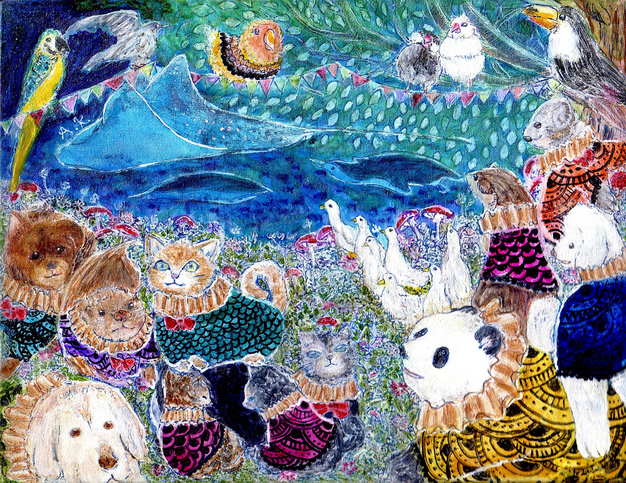 世界にひとつの水彩原画です 原画「王様ペンギンの夢見る世界」 画材:アクリル/ペン/ペンキュア/キャンバス サイズ:150×150mm 専用箱:なし